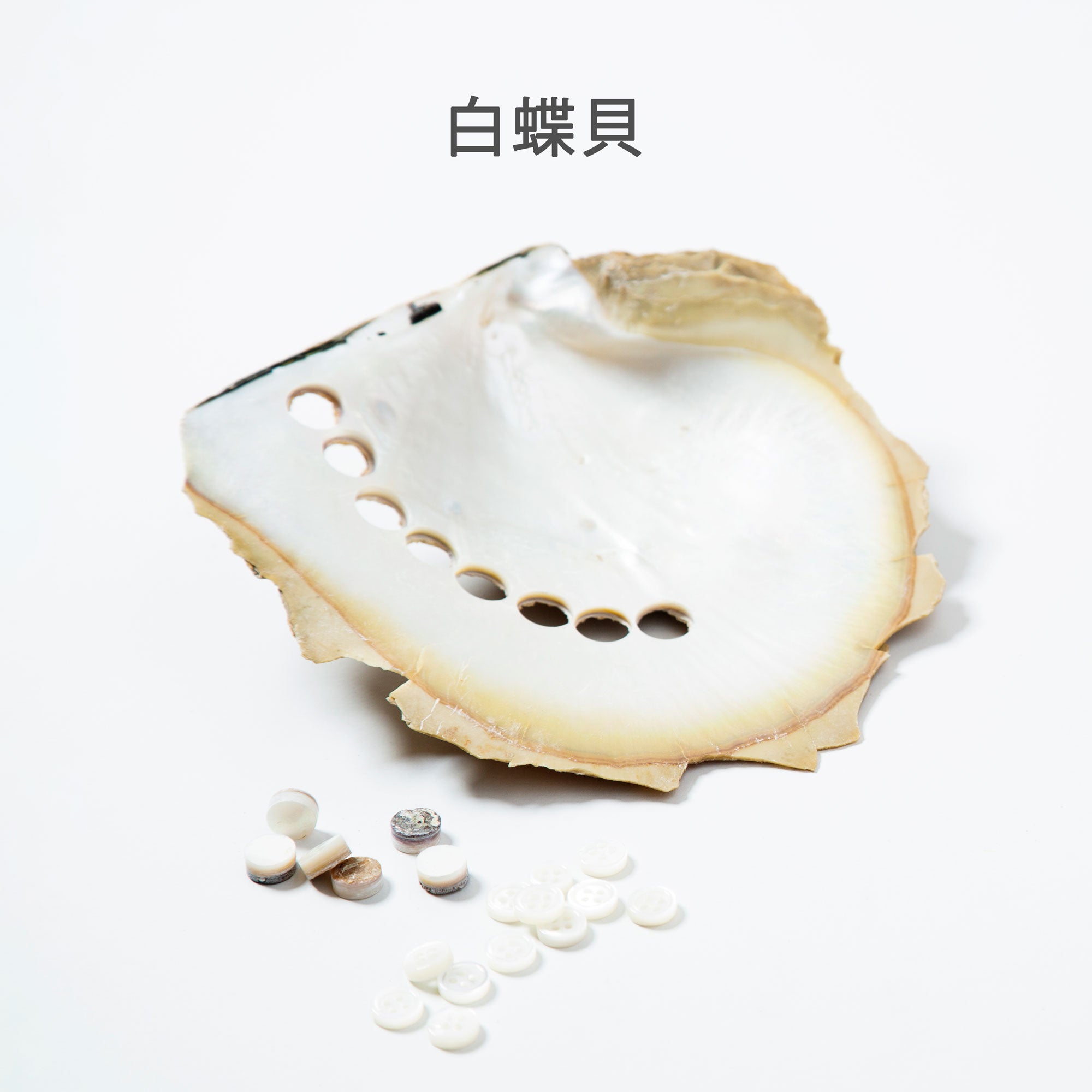 また、一般的に使用されている白蝶貝ボタンの厚み(高さ)は2㎜ですが、ARCODIOでは厚み(高さ)が3㎜のモノを使用しています。(白蝶貝に関わらず、シャツに使用される貝ボタンは2㎜が一般的です)