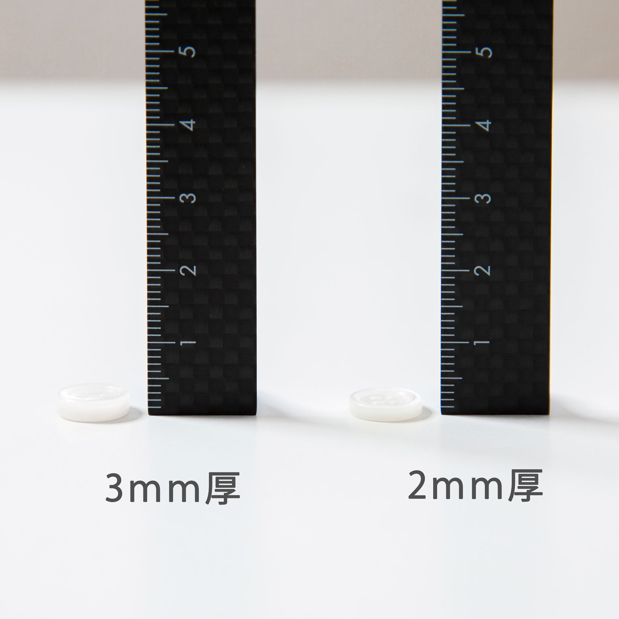 貝は自然のモノなので3㎜の厚さでくりぬける貝自体が少ない、もしくは同じ貝でも3㎜の厚さでくりぬける場所が少ない為、白蝶貝の2㎜厚ボタンと3㎜厚ボタンとでは約2倍の価格差があります。