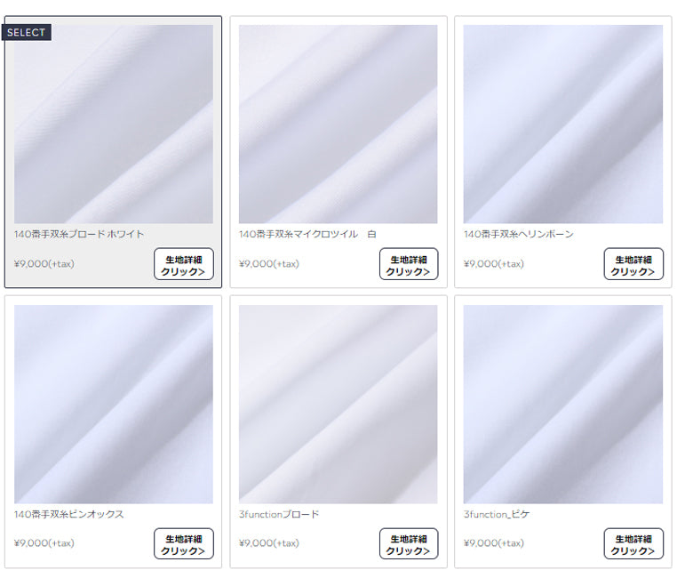 選択している生地は枠が濃くなり、左上に『SELECT』アイコンが表示されています。