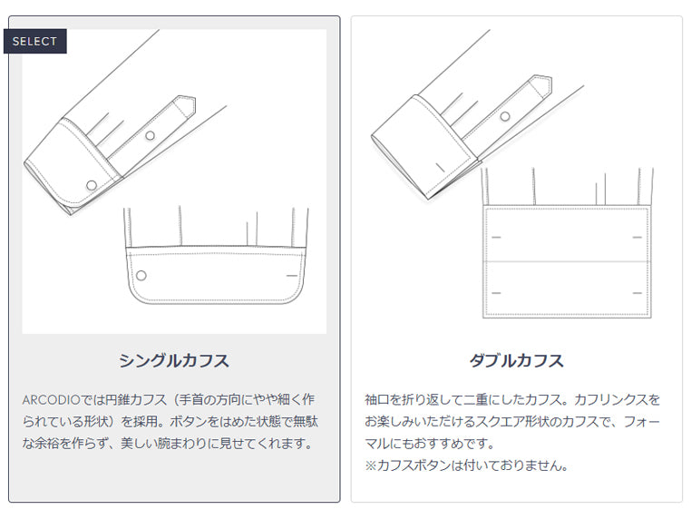 カスタムオーダーではシングルカフス以外に、ダブルカフスやコンバーチブルカフスからお好みのカフスをお選びいただけます。