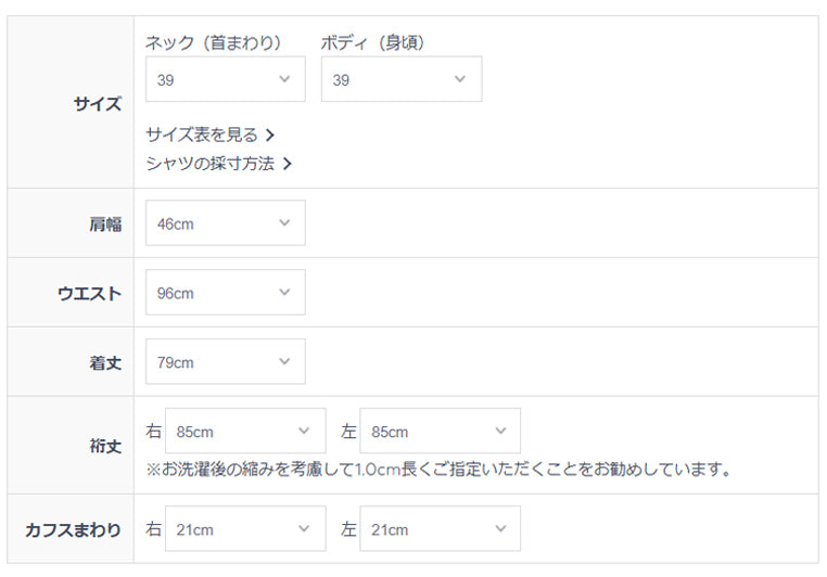 袖の長さ調整をご希望のお客様は、お手持ちのシャツの裄丈の長さと比較していただき、ご購入の際に【裄丈修理】でご希望寸法をご指示ください。