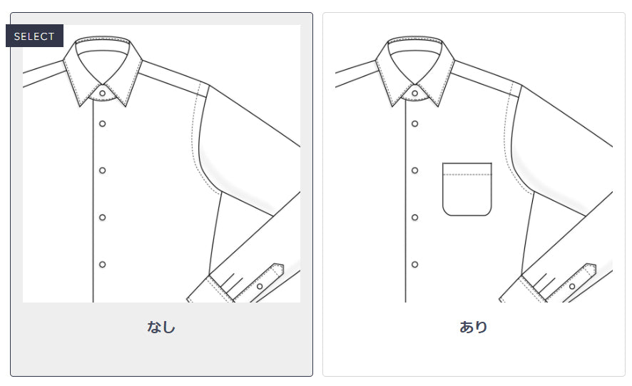 既製品は全てポケット無しですが、カスタムオーダーでは胸ポケット付きシャツの作製が可能です。