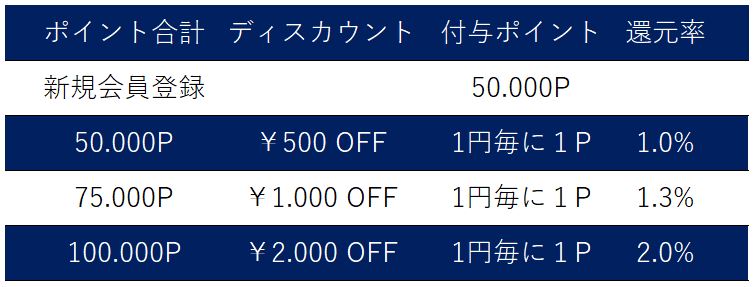 50.000ポイント貯まった時点で¥500OFFクーポンが発行可能になります。還元率は保有ポイントにより異なりますが、最大で2%の還元率となっています。