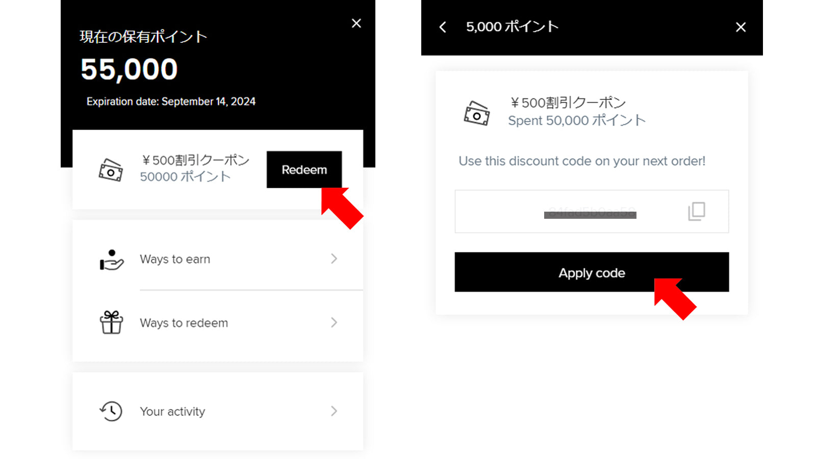 「Redeem」ボタンをクリックすると、お客様専用のクーポンコードが発行されます。「Apply code」ボタンをクリックしてからお買い物していただくと、決済画面でクーポンコードが適用された状態になります。