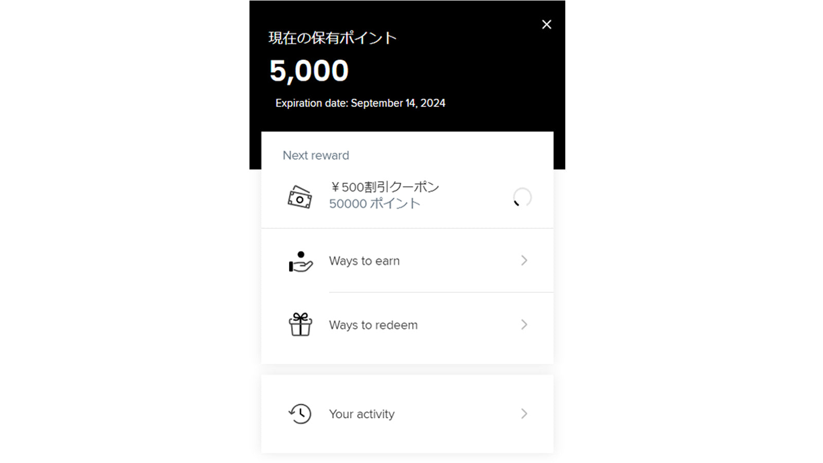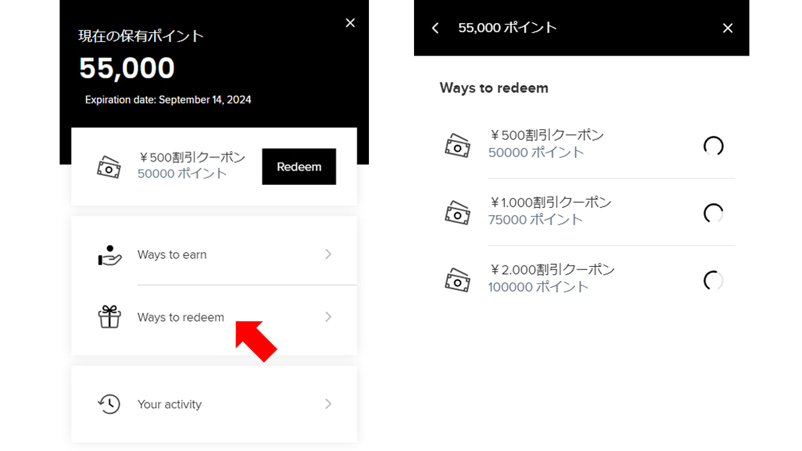 「Ways to redeem」をクリックすると第2ステップの75.000P「¥1,000割引クーポン」と第3ステップの100.000P「¥2,000割引クーポン」のポイントゲージが表示されて、到達ポイントまでの状況が確認できます。