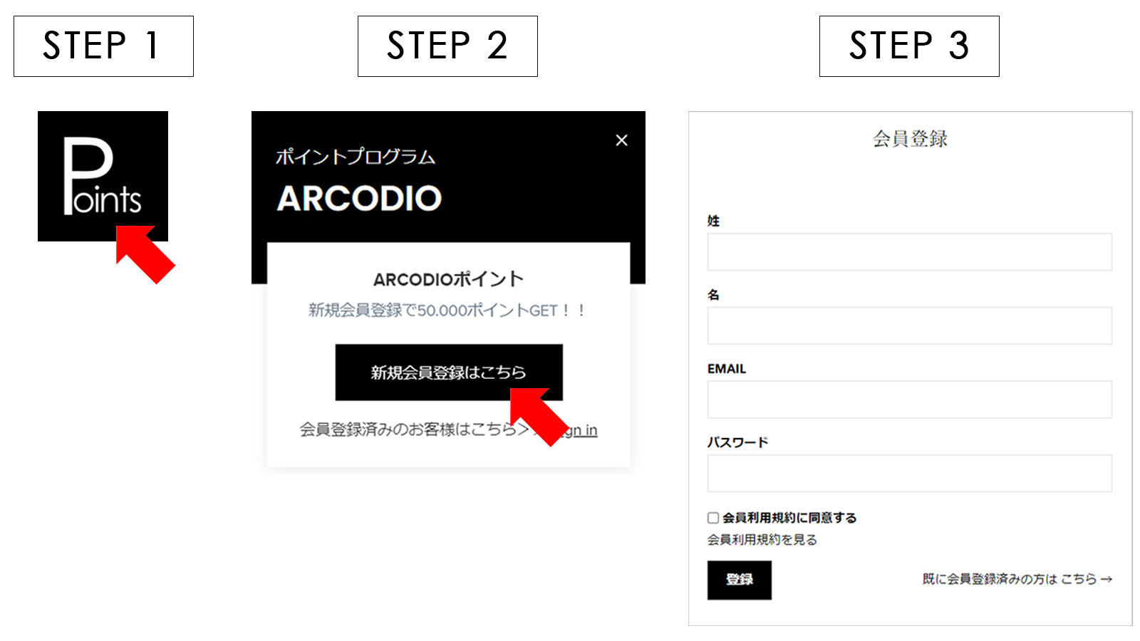 画面右下のPointsマークをクリックして、POPUP画面中央「新規会員登録はこちら」をクリックすると会員登録ページに遷移します。こちらで会員登録を行ってください。