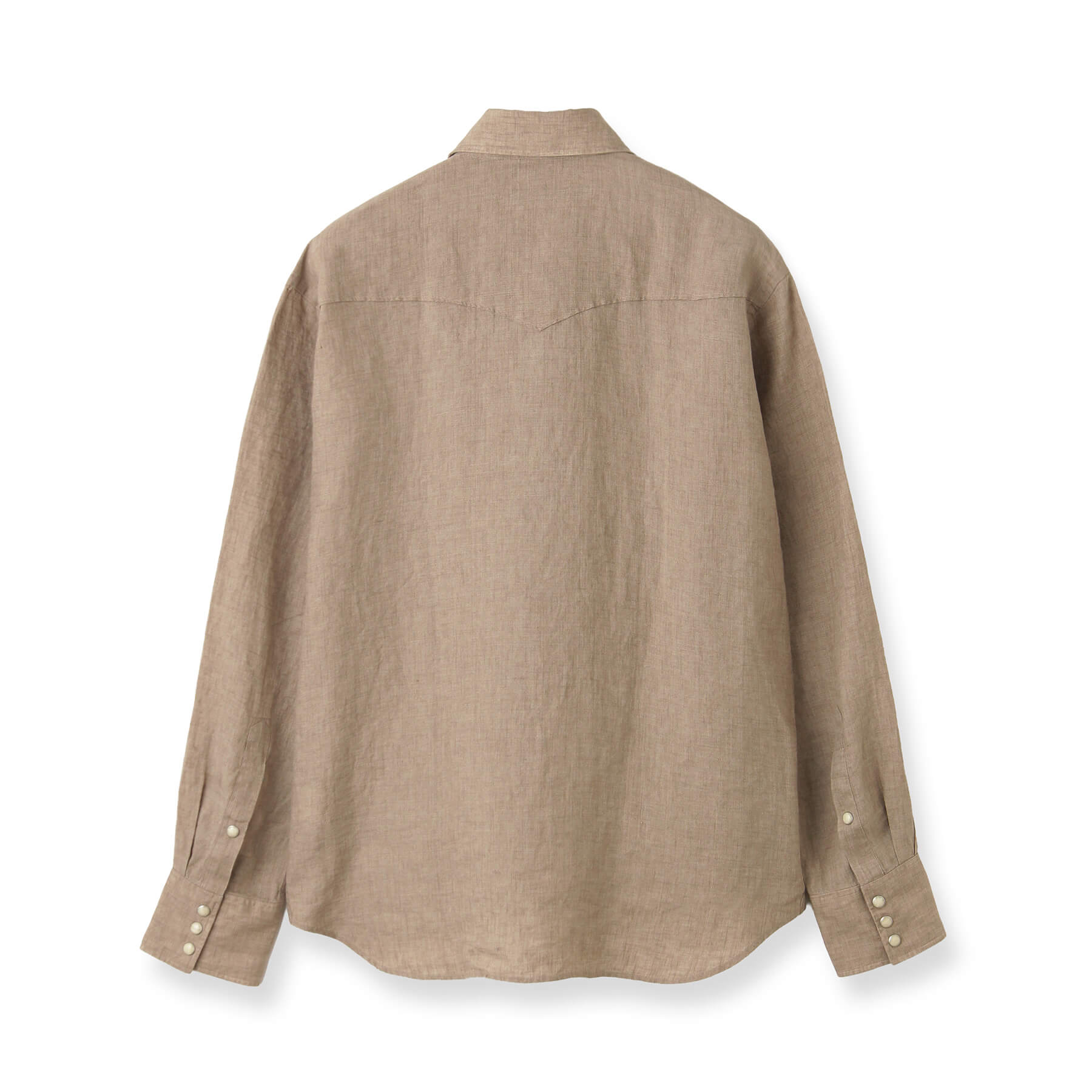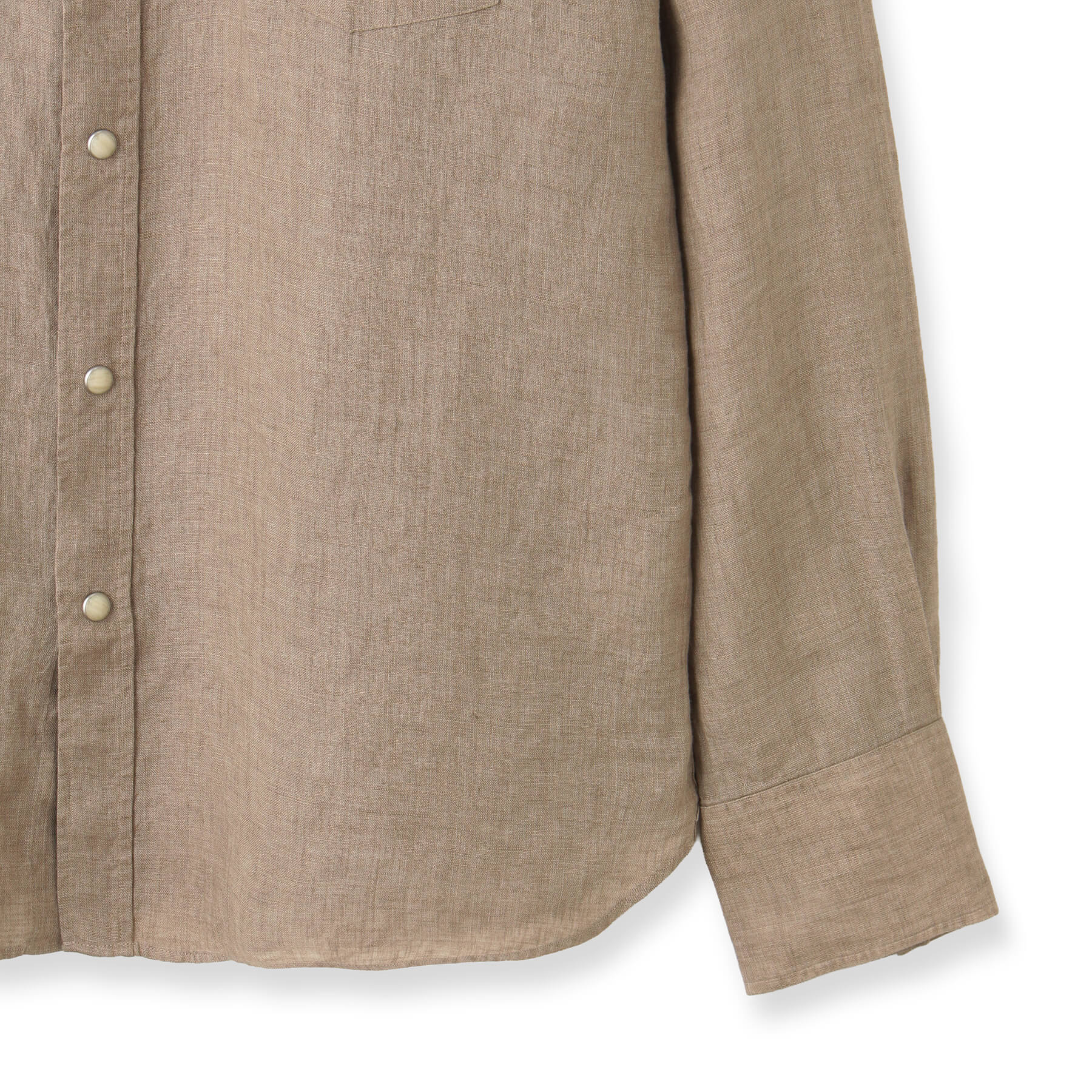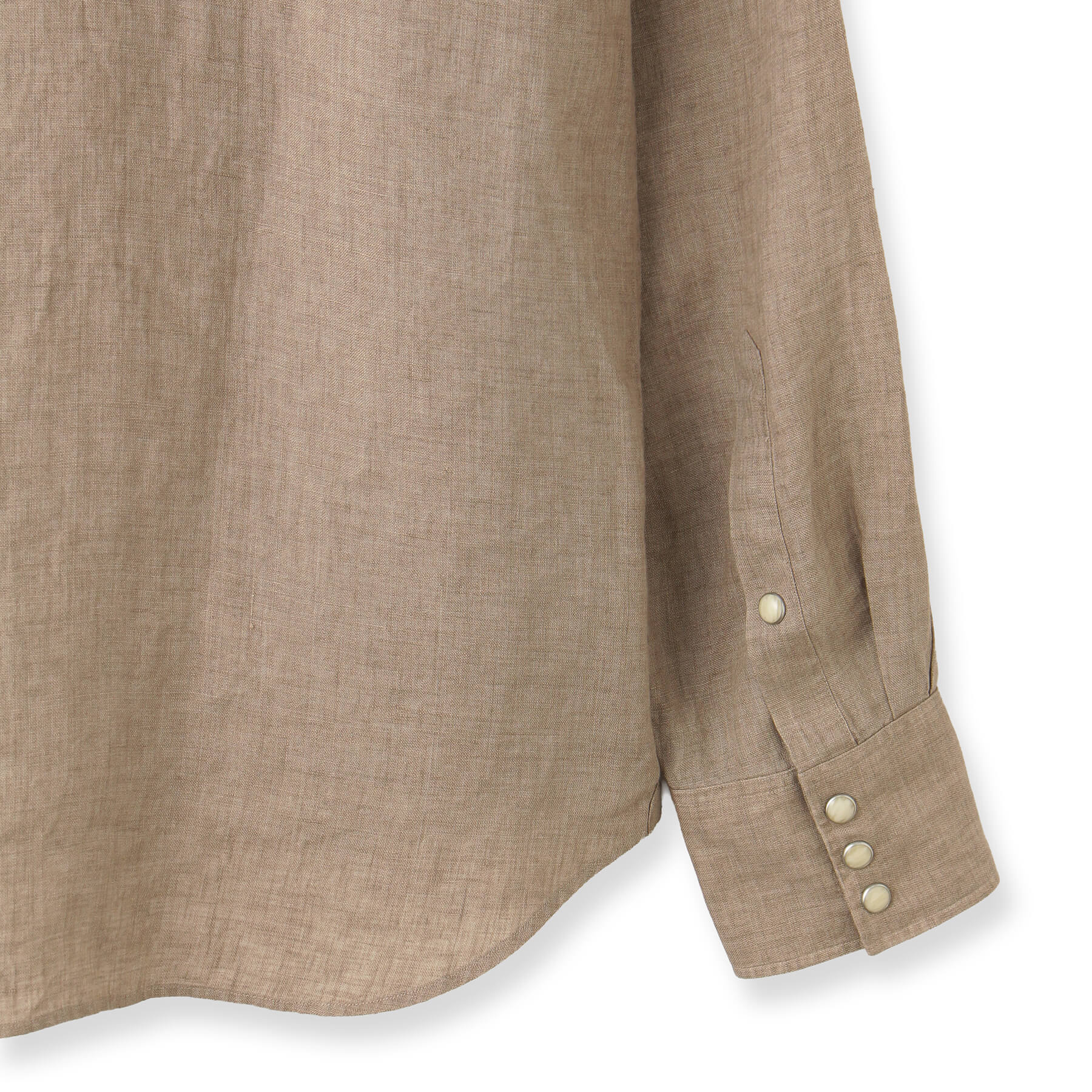 生地表面にはリネン特有の糸の節(ネップ)やムラが見られ、細かいシワが付きやすい素材ですが、これもまたリネンならでは。洗うごとに優しく柔らかな肌触りへと変化し、肌に馴染むため、味わい深く、洗いざらしはもちろん、きちんとアイロンをかければキレイめなカジュアルスタイルにもマッチします。