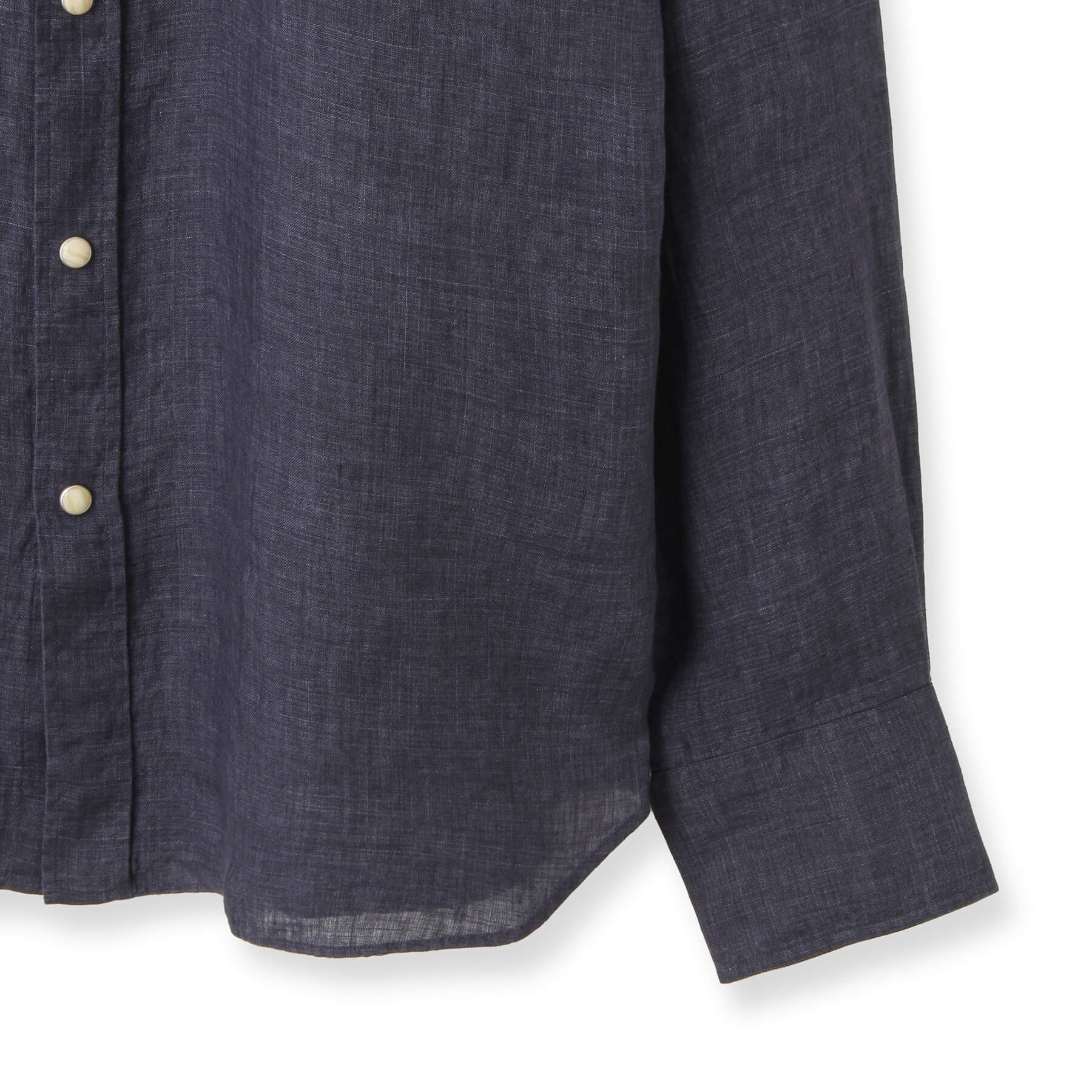 生地表面にはリネン特有の糸の節(ネップ)やムラが見られ、細かいシワが付きやすい素材ですが、これもまたリネンならでは。洗うごとに優しく柔らかな肌触りへと変化し、肌に馴染むため、味わい深く、洗いざらしはもちろん、きちんとアイロンをかければキレイめなカジュアルスタイルにもマッチします。