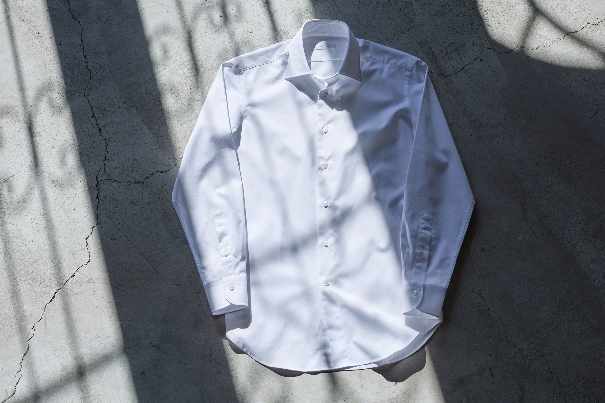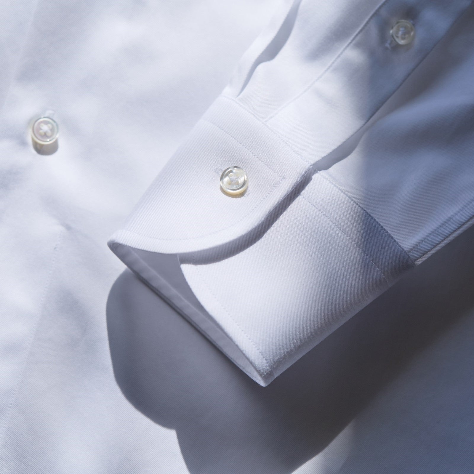 もちろん、他のARCODIOのドレスシャツと同様に、ドレス仕立てで縫製し、ボタンは3mm厚、ハンドステッチのディテールを施しています。