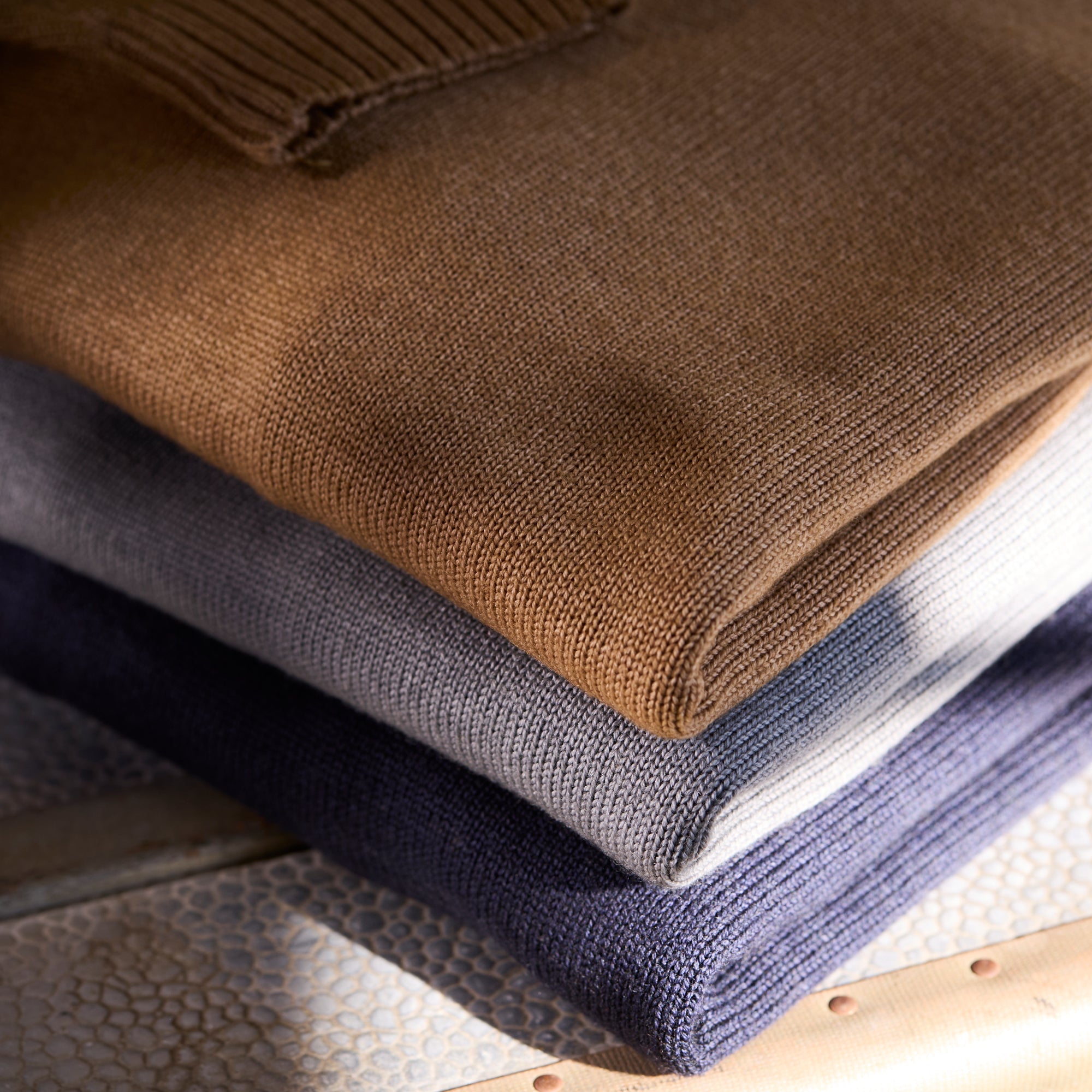 長年着込んだような奥行きと陰影が生まれ、シンプルなニットにも深みとニュアンスのある表情が加わります。