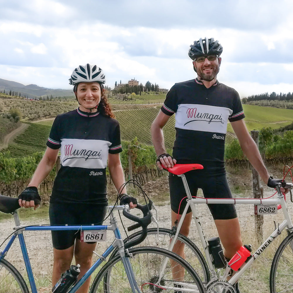 Matteo---自転車に乗ることが好きで、古い自転車でエロイカというトスカーナで始まったオールドサイクルの愛好者が集まるレースに参加したりしています。この写真のサイクルジャージは昔と同じくウールでできていてムンガイのマークは刺繍になっています。